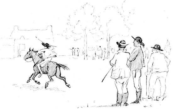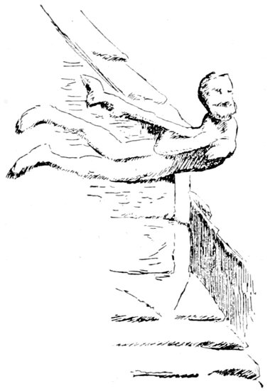 Then the outsiders of the crowd get up and watch the proceedings (including a cook in white cap and apron, who sits upon the hotel wall), some eagerly from curiosity apparently, some with devotion, and some, it must be confessed, with an easy, jaunty air more appropriate to a show in a country fair. There are several hundreds on the grass before us in the bright sun, in the glare of which the sketch was taken, sitting together in parties, kneeling in prayer, or standing close together intent upon the scene.