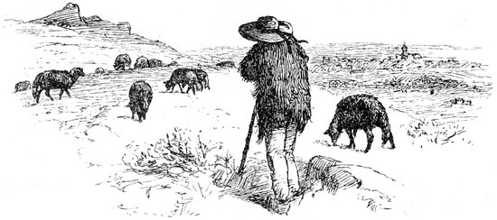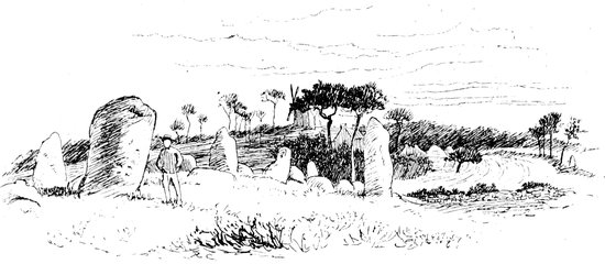 182It is a summer’s day, and the light south wind that comes over the sea, and gently sways the trees inland, here blows up the sand into our faces, and moans between the stones. It is such a wild and dreary place—where, excepting for a farm and an oasis of a few trees, there is no welcome colour presented to the eye—that the mind leans naturally to the mysterious side, and clings rather to legend and tradition than to historic facts; thus we may see in this confused array an army of pagan warriors turned into stone, and cling, like the present inhabitants of Carnac, to the story of the patron saint of their herds and flocks (St. Cornély), who, pursued to the sea by a host of armed men, and finding no means of escape, cursed his pursuers and turned them into stone.