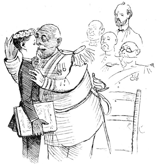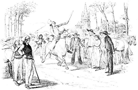 193The people that we see are for the most part pleasant and prosperous-looking, busy in commerce or in agriculture. There is, it is true, more than one regiment of the line quartered here, and the cafés, bright with plate-glass and gilding, are full of warriors of various sizes; in the morning and in the evening the air vibrates with regimental drums, but there is little else to remind us that the inhabitants are the direct descendants of a warlike nation, and that barons and knights once defended the battlements and towers of Vannes. The morning is spent at billiards in most of the cafés, and in some, especially frequented by the townspeople, there are such groups as the above.