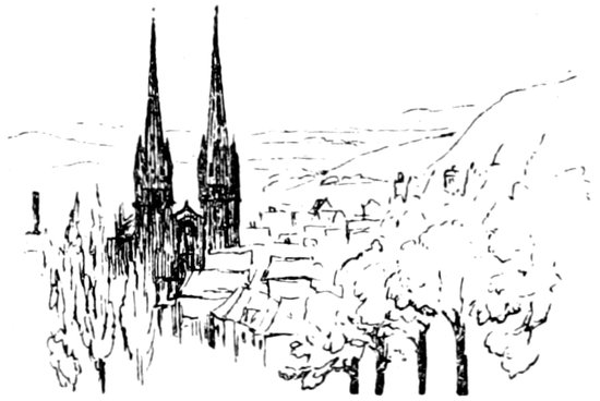 There is a tradition attaching to this chapel, that a knight, hunting in the neighbourhood in the fifteenth century, was overtaken by a storm in the valley below, and, being preserved from falling rocks by the prayers of Ste. Barbe, erected this chapel to her memory. From that day there has been an annual pilgrimage to Ste. Barbe, when some of the devotees creep round the precipitous exterior walls as an act of penance. Before leaving, we pass up the rough stone 160steps in the sketch to even higher ground, where there is a small chapel dedicated to St. Michel. It is fortunate to have seen the view from Ste. Barbe on a clear day, for the clouds, which gather in the distance, as white as snow, through the tree tops, come up in a few hours and shroud the land.
