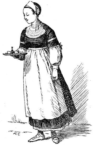 Let us first give our experiences of the principal inn, which is on the left, looking up the street in the sketch, where travellers are driven under an archway into a wide stable-yard, and enter the house by the kitchen. The beds are clean and comfortable enough, the fare is homely but plentiful, and there is nothing to scare away the most fastidious. At the midday meal we have trout, caught a little way down the river Scorff, one or two dishes of meat, an omelette if desired, and, as usual, very good bread, butter, and cider. The dinner, or evening meal, is rather more elaborate, especially if a fresh traveller has come in. The view, across the table at breakfast time, of the presiding genius of the inn, the bottle of cider, the large wineglass, and the half cut loaf, are all depicted exactly. The vacant chair is soon to be occupied by a commercial traveller, who has been busy all the morning in the town, doing more havoc in the one day that he devotes to Guéméné than we like to think of. He represents a cheap clothier’s house at L’Orient, and has tempted many of the quiet inhabitants to change their simple stuffs and white caps for the more fashionable dresses and hats of the town. It should be 165remembered, however, that it is to this very commis voyageur, whom we travellers are apt to treat with scant courtesy and whose proceedings we often regard with anything but pleasure, that we owe the comforts of these inns, and the possibility of travel in remote places. The commercial traveller, coming from Vannes or L’Orient is the pioneer in such towns as Guéméné; he teaches the Breton innkeeper the mysteries of civilised life, and the art of living differently from the lower animals. It is a heavy penalty to pay, from the artistic point of view, that he should bring his patterns and his sham jewellery, and leave so much of it behind in Guéméné. But our little waiting-maid is not yet converted to the policy of adopting modern ways. Her spotless white cap and sleeves, neat dress, and rows of pendent coins, are of a pattern as old and characteristic as the gables of the houses of Guéméné.