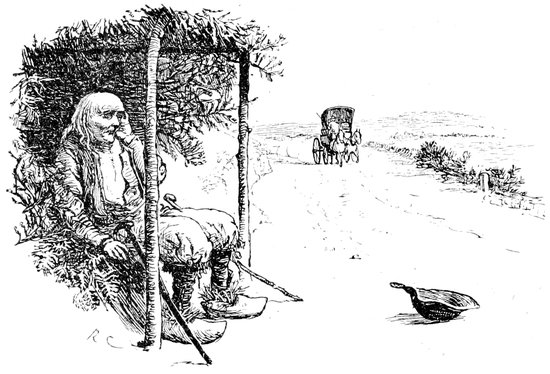 173The morning of the 25th of July is bright, and the gilt statue of Ste. Anne glitters above the trees. If at this moment we could look down from the spire of its church, upon the country round, we should see on every road, and across the open land, little dark specks which are pilgrims all tending one way—to the shrine. They have been coming all through the night, camping in the fields and sleeping at the roadside. The broad Roman road from Vannes is covered with carts and carriages, and more people are arriving by the river.