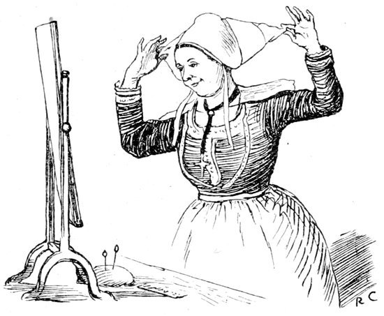We have spoken often of the simple, practical, and graceful dress of the women; but here at Auray we must confess that many of the country people in full holiday attire are anything but graceful in appearance. At a side altar of the chapel there is a young face, very fair, with large devotional eyes, deepened in colour and intensity by her white cap; but below it is a stiff, shapeless bodice as hard as wood, and a bundle of lower garments piled one upon the other, till the figure is a rather ungainly sight; her large capable hands hold her book, her rosary, and a stout umbrella; she is encumbered with clothing, but she differs from her modernised sisters in one thing: her dress is not on her mind when she says her prayers. She is on her knees nearly all day at Auray; but, working or praying, half her young life has been spent in this position. In spite of the grotesque element, which is everywhere at Pardons, the sight is often a sad one; sad, especially, to see so many young faces clouded by superstitious awe. The saying would seem to apply to Brittany, that “national piety springs from a fountain of tears.”