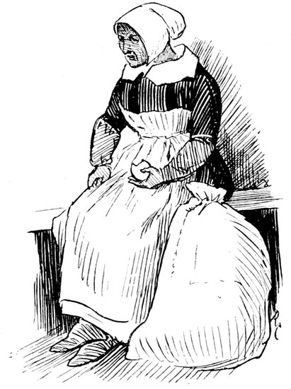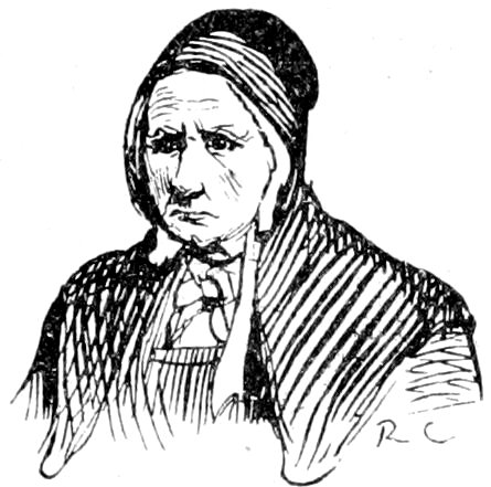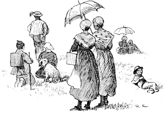 They stand bareheaded in the sunshine, old and young, rich and poor; on the left, the pretty bourgeois’ daughter, from Auray, in plain cloth dress, with velvet body, dark green shawl, and neatest of shoes; behind her, in the background, a contingent from more remote districts, farmers and small traders, the majority being comfortable people who have come by train. The spare old woman with eccentric expression and worn hands, holding purchases, or plunder, in her apron, is not a pauper, but a hanger-on at a large household, who has saved money. Next, nearer to us, is a peasant farmer, with long grey hair, in white jacket and breeches and leathern girdle, who has come on foot from his home in the interior. He has walked all through the night to be present at the Pardon, as he has done every year, going through the round of services and exercises, contributing several francs in money to the church, buying a few charms and trinkets, and then plodding home. Behind him, with stick and umbrella under arm, holding beads in her hand, with fat red face, a white hood and apron, is a comfortable farmer’s wife from Baud; on her right an old woman in dark green coiffe, framing a screwed-up face, a study of colour in bronze and green. Behind them is a tall, bareheaded man with his daughter, two of the best types of Bretons in the crowd. On the right in the sketch is a pretty figure with a cross on her breast, with shining face, in the white cap and wide collar so common in Finistère; and, next, three peasants, old and wrinkled, bronzed with sun and grime, the common type at Pardons. Thus—leaving out some of the more hideous aspects of deformity and disease—this sketch gives an exact picture of the crowd, and a true idea of the strange mixture of curiosity, amusement, and religious awe with which the celebration of Ste. Anne is received in the present day.