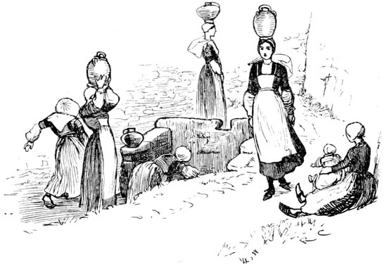 Ten miles in a north-westerly direction, in some of the finest scenery of the Montagnes Noires, is Gourin, a small town in the centre of a district of old iron mines, stone and slate quarries. Mr. Caldecott, who visited this district in a previous year, in bad weather, speaks of the “wide, dirty, uninteresting-looking street of Gourin, at the top of which is the Hôtel du Cheval Blanc,” but he has made a sketch of the women washing at a stream just outside the 161town, which only wants colour to be one of the most picturesque of our series.