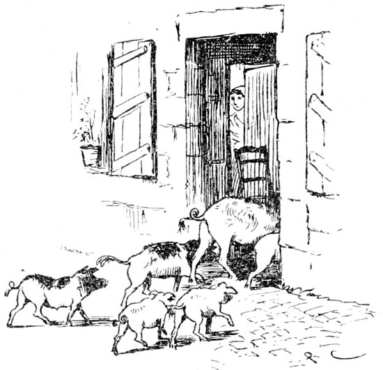 “The dining-room of the inn at Gourin opens on to the public Place, and is frequented by commercial travellers and two or three residents; one of the latter, being a chasseur, is followed through the glass door by a pack of hounds, the large sporting spaniels of the country, and at each guest’s elbow a dog stations himself to receive gratuities.”