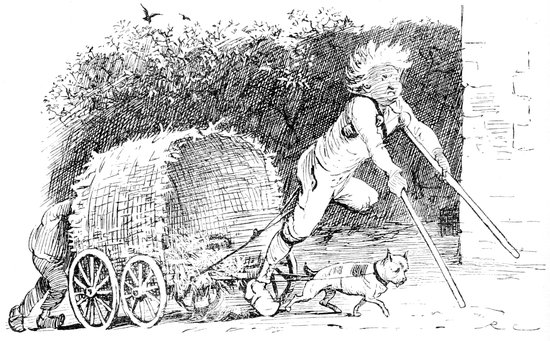 We have seen in Le Faouet some of the finest types of Bretons, both men and women. Let us record one figure which will never be 158effaced from memory. Passing down a street leading from the principal square, we meet coming up the hill bareheaded, in the full blaze of the sun, in the dust and heat, the strange, wild-looking figure in the sketch; his clothes are patched, his hair is white, his face red; with crutches, and one leg, he drags (with the help of a dog and one or two charitable children) his house, with him about the town. It is a strange conveyance made of sticks and dried ferns, but it is home. Travellers see strange sights, but surely no sight more grotesque was ever seen than “the man on two sticks” of Le Faouet, whose portrait is given to the life.