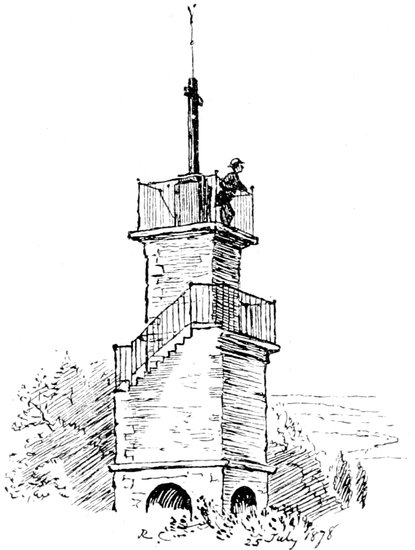 172On a wide Place a few yards off, called the Belvédère, is a column to ascend to see the view, looking northward and eastward, in the direction of Vannes, over a wide stretch of cultivated land, pastures, and woods, dotted with white houses and church spires, one of which is Ste. Anne d’Auray. Immediately beneath is a rocky, precipitous path down to the river, with small vessels loading and unloading, and the grey roofs of toy-like houses and warehouses on the quay. A sudden cloud of smoke, which curls through the gorse and bushes which conceal the greater part of the river from view, comes from a little steamer which has arrived from Belle-Île with the evening tide, and has brought another crowd of pilgrims for Ste. Anne. All is quiet and beautiful from this vantage-ground; the air is soft, and slowly waves the tree-tops in the avenue which skirts the Belvédère on its southern side; there is nothing to indicate the tumult of to-morrow.