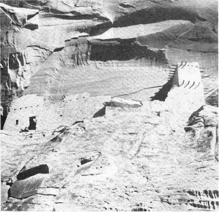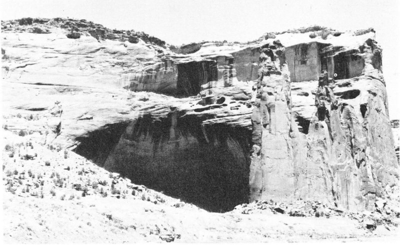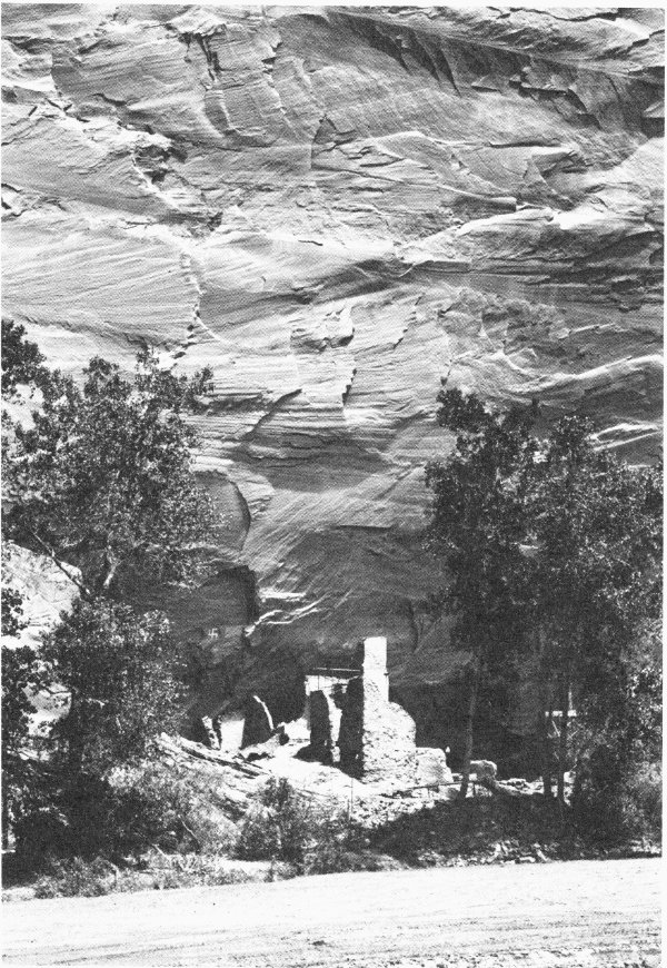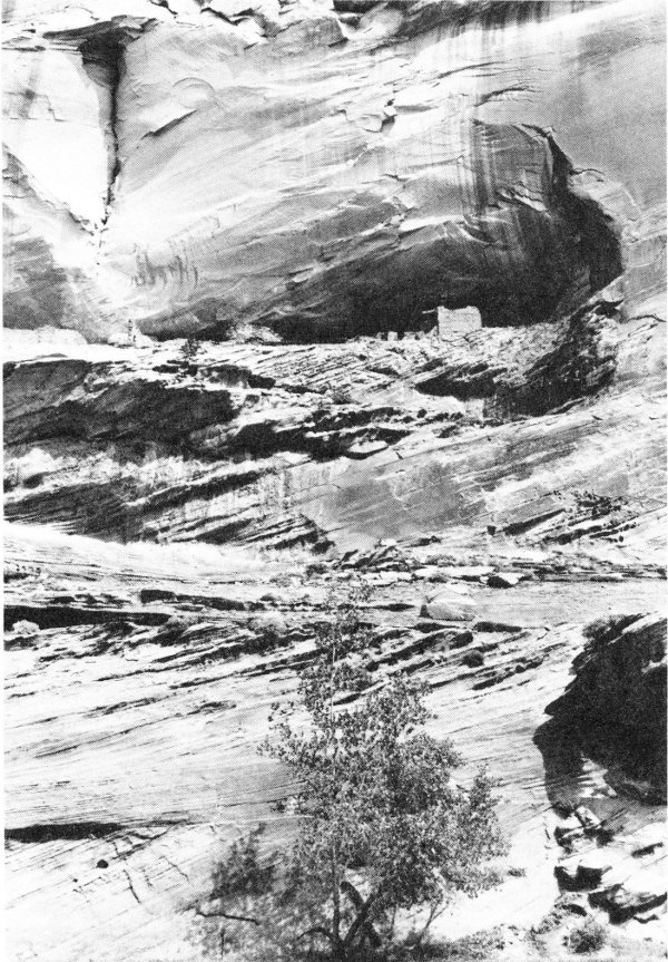 This cave in Canyon del Muerto was named for a large white and blue pictograph of a cow, drawn in the historic period and undoubtedly the work of a Navajo. Not much can be seen of this ancient ruin, for Navajos have lived on the site in recent times and still use the old bins for storing corn and the leveled areas for drying peaches.