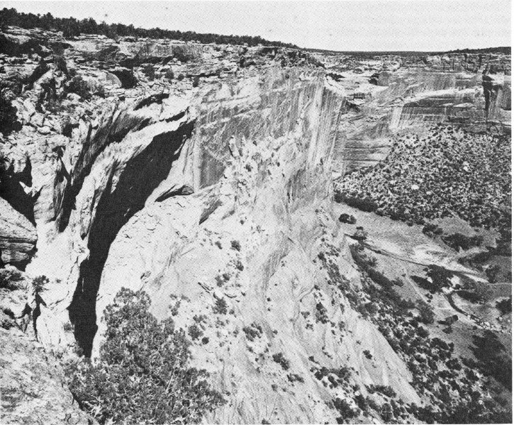 The ancestors of the Navajo Indians who now live in the shadows of these deep canyons came here long after the earlier peoples had left. Originally the Navajos did not live in the canyon, but only passed through it on their yearly migrations. Today some live here permanently, and their hogans are scattered along the sandy canyon floor, almost hidden by the thick growth of willows and cottonwoods and detectable only by a column of smoke slowly rising from a cook fire or by the barking of dogs. Occasionally one may catch a glimpse of a brightly dressed woman working around the hogan or of black-hatted men trotting their horses between the nearby trading post, cornfields, or peach orchards. A reserved and dignified people, they still live in the tradition of their fathers.