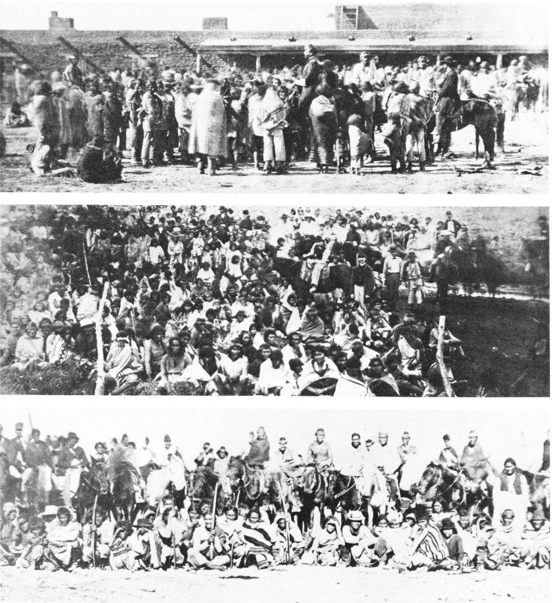 Scenes of the Navajos in their place of exile at Fort Sumner on the Pecos River. The top view shows them lined up to receive their issue of food and clothing. National ArchivesMuseum of New MexicoNational Archives