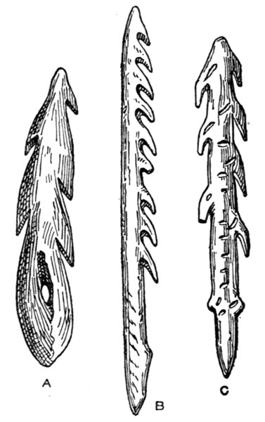 With regard to the six fishes in the picture of "The Three Red Deer," I think that there can be little doubt that they are put in in the same spirit of exuberance which induced early Italian masters to introduce a cherub wherever a space for him could be found. The fish represented are the same in each case, and are undeniably salmonids. Presumably they are drawn on a larger scale than the deer. Their markings and the form of the head are deserving of some criticism and comment by those who are familiar with fish as seen by the fisherman. Probably the artist's friends at Lourdes captured fish in those days by spearing them with serrated bone-headed fish spears or harpoons (Fig. 3). No fish hooks of bone have been found in the cave of Lortet or in others of like age, although needles and whistles of bone and other useful little instruments, as well as serrated spear heads and harpoons have been obtained in several of them.