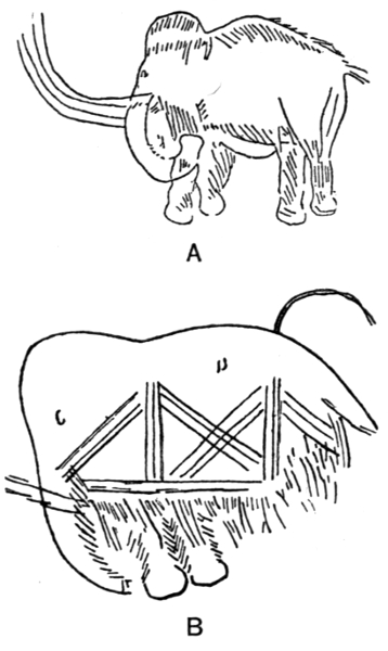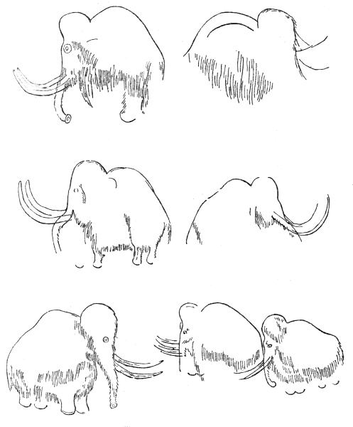 The illustrations in this chapter are (with the exception of Fig. 7) copies, greatly reduced in size, of faithful representations of the great hairy elephant or mammoth which still survived in southern France in the days when the caves were occupied and decorated by men. I am indebted to the valuable little book "Repertoire de l'Art Quatermaire," by M. Salomon Reinach, for these outlines carefully drawn by him from various large illustrations by the use of a tracing and reducing instrument. In the next chapter I have given examples from the same source of similar drawings of other animals.
