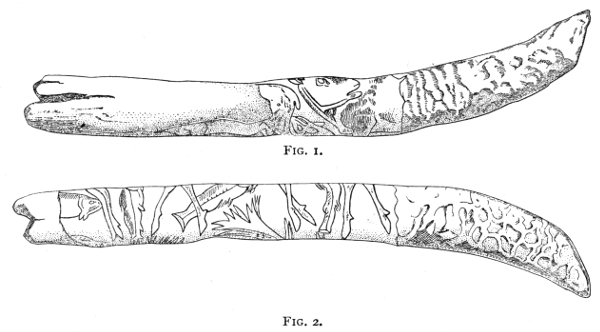 IN Figs. 1 and 2 on the next page a cylindrical piece of the antler of a red deer is represented of half the natural size. On it are carved by in-sunk lines certain representations of animals. It was found in the cavern of Lortet, near Lourdes, in the department of the Hautes Pyrénées, in the south of France, together with many other remains of prehistoric man. This cavern was excavated and all its contents of human origin carefully preserved by M. Edouard Piette in 1873 and the following years. Drawings of this and other remarkable carved pieces of bone and antler, many in the form of harpoon heads, and of small chipped flint implements, all found in this cave, were published by him. [1] He excavated also several other caverns with great care, and his collections were bequeathed by him on his death to the great Museum of National Archæology at St. Germain, near Paris, where I have had the advantage of studying them.