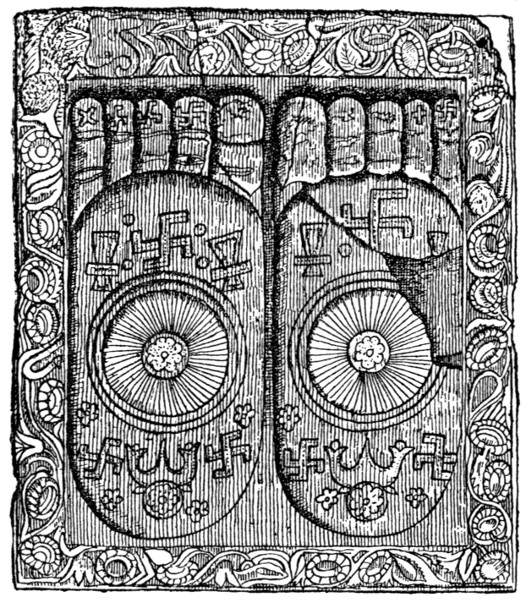 In Figs. 40 to 45 a few examples are shown of the Swastika from various places and ages. It was in use in Japan in ancient times, and is still common there and in Korea. In China, where it is called "wan," it was at one time used, when enclosed in a circle, as a character or pictograph to signify the sun. It has been employed in China from time immemorial to mark sacred or specially honoured works of art, buildings, porcelain, pictures, robes, and is sometimes tattooed on the hands, arms, or breast. In India it is widely used in decoration by both Buddhists and Brahmins; children have it painted on their shaven heads, and it is introduced in various ceremonies. The gigantic carved footprints of Buddha from an Indian temple drawn in Fig. 40 show several Swastikas on the soles of the feet and on the toes. In the Near East and in Europe the Swastika is no longer in use: it is not, in fact, popularly known. But in ancient and very remote times it was in constant use in these regions, especially by the Mykenæan people and those who came under their influence, and also by the people of the Bronze Age—before the use of iron in Europe. Fig. 41 shows a vase of Mykenæan age (about 1200 years B.C.) from Cyprus ornamented with Swastikas. Hundreds of terra-cotta "spindle-whorls" like Fig. 42 [Pg 193] were found by Schliemann in excavating Hissarlik and the site of ancient Troy, and some of them date from 3000 B.C. in layers of different ages. The vase on which is painted the ornament shown in Fig. 43 is from Bœotia, and belongs to the same early period—the "Mykenæan" or "Ægæan" before that of the Hellenes. It still survives in the pottery of the Dipylon period (circa 800 B.C.), as is seen in the fragment drawn in Fig. 6, Chapter I. The later Greeks of the great classical period (Hellenes) did not use the Swastika. Nor has it been found on the works of art of the ancient Egyptians, nor in the remains of Babylonia, Assyria or Persia. It, in fact, seems to have belonged especially to that ancient "Minoan" civilization, the remains of which are found in [Pg 194] Crete and the other Greek islands. The same culture and the same race is revealed to us by the discoveries of Schliemann at Mykenæ and other spots in Greece, and at Hissarlik, the seat of ancient Troy. The Mykenæan art seems not to have been transmitted to the post-Homeric Greeks, nor to Egypt, nor to Babylonia and Assyria. The Swastika seems, like the "flying gallop" of Mykenæan art, to have travelled in very ancient times by a north-eastern route to the Far East. I have given some account of the latter, with illustrations, in "Science from an Easy Chair," Second series. Like the representation of the galloping horse, with both fore and hind legs stretched and the hoofs of the hind legs turned upwards, the Swastika is found in the remarkable metal work (Fig. 43 bis) discovered in the necropolis of Koban, in the Caucasus, dating from 500 B.C. The Swastika and the "flying gallop" probably travelled together across Asia to China and the Far East, and so eventually to India on the one hand and Japan on the other—the Swastika thus escaping altogether, as does the pose of the "flying gallop," the Near East and later Greece. This is a very remarkable and interesting association.