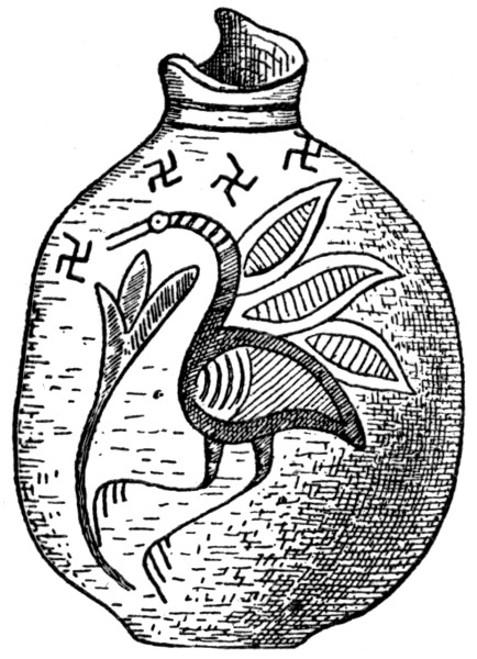 At the same time, I have no conviction that this is the real origin of the Swastika, and await further evidence. The "flying-stork theory," which was put forward by Reinach, is very attractive. Birds as badges and "totems" are frequent among primitive mankind, and certain species are often regarded as sacred and bringing good luck. The stork is one of these. If the artists who marked the very ancient clay-pottery of Hissarlik with the Swastika and also with outlines of the flying stork, strongly resembling a Swastika, did not derive the Swastika from the stork, but had received it from some independent [Pg 214] source, then it is probable that they purposely drew the flying stork, so as to make it resemble as much as possible a Swastika.