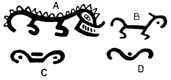 The tendency for drawings of men and animals when used as decorative designs to degenerate, in the course of time and repetition, into more and more simple lines, to become more and more "grammatized" and simplified, till at last their origin is hardly recognizable, is both a very remarkable and a very usual thing. The process of degeneration, step by step, can often be traced, and curious remnants of important parts of the original drawing are found surviving in the final simplified design. The paddles and other carvings of some of the South Sea Islanders show very curious "degenerations" of this kind. A carved human head with open mouth becomes by repeated copying and simplification a mere crescent or hook, which is the vastly enlarged mouth of the original face. It alone survives, and is of enormous size, when all other features and detail have been abandoned. In some carvings of a face the tongue is shown projecting as an indication of defiance. In course of simplification in successive reproductions the face becomes a mere curved surface with a large pointed piece standing out from it; [Pg 205] it is the tongue. That one significant thing—suggesting defiance—alone persists. The study of this process in human art covers a very wide field, including all races and all times. An excellent example is that given in Fig. 51. It shows the step by step "grammatizing" of a favourite decorative drawing—that of an alligator, as painted by the Chiriqui Indians of Panama on pottery. We start in Fig. 51, A, with an alligator, already considerably "schematized" or conventionalized. The Indians could do better than that, but it served for pottery decoration. The figures B, C, D show three stages of further "grammatizing" of the design (from different parts of the surface of a pot) till, in D, we get the alligator reduced to a yoke-like line and a dot!
