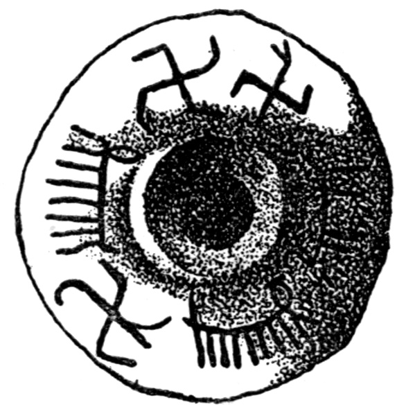 The Mykenæans and their island relatives obtained the Swastika either from the ancient Bronze-age people of Europe or else gave it to them, since it is very nearly as common as a decoration or symbol on the bronze swords, spear-heads, shields, and other metal work of these prehistoric people of the middle and north of Europe (also occurring in the pottery of the Swiss Lake dwellings), as it is in the islands and adjacent lands of the Eastern Mediterranean. The Swastika is also found abundantly on the early work of the Etruscans, but disappeared from general use in Italy, as it did from the rest of Europe, before historic times, although occasionally used (as in the decoration of the walls of a house at Pompeii). All over Germany, Scandinavia, France, and Britain it is found (Fig. 44) on objects of the Bronze period—sometimes on stone as well as on bronze utensils, ornaments, and weapons. A few objects of Anglo-Saxon age are ornamented with it—especially remarkable is a piece of pottery of that age from Norfolk (Fig. 45).