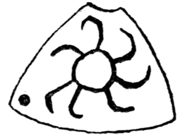 It is generally held that the Swastika must have been introduced into America in prehistoric times by early redskin immigrants from Asia. The question has been raised as to whether this introduction was before or after the worship of Buddha in Asia. It is only amongst Buddhists that the Swastika has a religious or sacred character. Elsewhere it seems to have been a mark or sign carrying "good luck." A representation of a sitting human figure incised on shell has been found in a prehistoric burial-mound in Tennessee, which has remarkable resemblance to the Asiatic statues of the Buddha. Shell ornaments have also been found here decorated with sharply-cut Swastikas, and in a mound in Ohio thin plates of copper were found cut into simple Swastika shapes like that of Fig. 38, four inches across. Modern Mexican Indians make brooches of gold and turquoise in the form of the Swastika, and it is a favourite device [Pg 198] among the Indians of neighbouring territory. Swastikas occur as decorations or lucky marks on the small terra-cotta "fig-leaf," which was worn by the women of some of the aboriginal tribes of Brazil, and have also been found on native pottery from the Paraguay River.