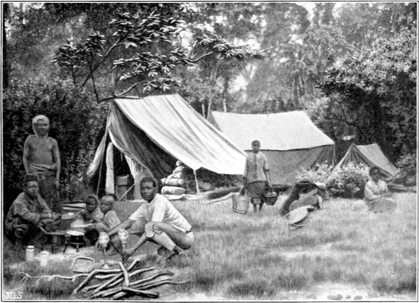 Im Lager wimmelte es wie in einem Ameisenhaufen, alles rührte sich in einer seltenen Geschäftigkeit. Die Zelte wurden aufgeschlagen, und rasch waren wir mit unseren liebenswürdigen Begleitern um den Frühstückstisch versammelt. Unsere niedlichen Frühstückskörbe, unsere Zelte, die Tische, Stühle und anderes Hausgerät, welches mein Mann für mich angeschafft hatte, wurde gebührend bewundert, dann aber auch fleißig getrunken und gegessen. Da es bald dunkel wurde, kehrten die Herren der Schutztruppe zurück, nachdem mein Mann ihnen für ihre Freundlichkeit gedankt hatte. Mit besonderem Danke sei hier noch einmal des Herrn v. Natzmer gedacht.