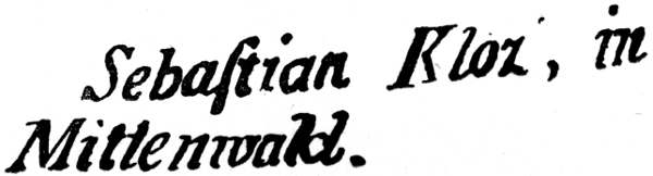 KLOTZ, MATHIAS, 1653-1745. Worked for about twenty years in Mittenwald, during which period he produced instruments of an unsatisfactory nature. He appears to have been aware of this, and with the object of increasing his knowledge, he undertook a journey to Florence and Cremona and other centres of violin industry. With his newly-acquired experience he returned to his native place and established himself in rather a large way.
