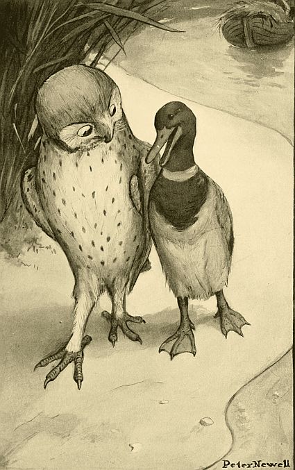 Once, while I was shooting Ducks, I had a strange experience. My decoy was a lady Duck with a string tied around her leg. I had fastened the other end to my boat anchor to restrain her natural wandering propensities. She was sailing around on the cold water, protesting at her unhappy plight, when a big white Owl heard her profane remarks.