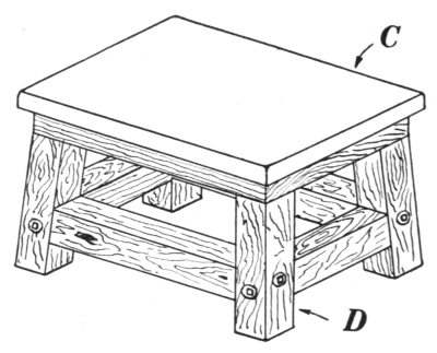 The water tub, or slack tub D, as it is more properly called, stands at the right of the forge near the coal box, where the water for dampening the coal can be most readily obtained. It is used for cooling the iron or tongs and for tempering tools.