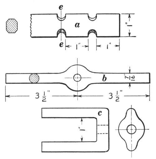 Chapter VI. Steam Hammer, Tools, and Exercises.—112. A Forging; 113. The Drop Hammer; 114. Presses; 115. The Steam Hammer; 116. Steam Hammer Tools; 117. The hack or cutter; 118. The circular cutter; 119. The trimming chisel; 120. The cold cutter; 121. The checking tool or side fuller; 122. The fuller; 123. The combined spring fullers; 124. The combination fuller and set; 125. The combined top and bottom swages; 126. The top and bottom swages; 127. The bevel or taper tool; 128. The V block; 129. The yoke or saddle; 130. Bolsters or collars; 131. Punches; 132. Steam Hammer Work; 133. Crank Shaft; 134. Connecting Rod; 135. Rod Strap; 136. Eccentric Jaw; 137. Hand Lever; 138. Connecting Lever; 139. Solid Forged Ring; 140. Double and Single Offsets |