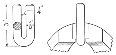 Very few shops have a sufficient variety of tongs to meet all requirements, and it is often necessary to fit a pair to the work to be handled. Sometimes quite serious accidents happen because the tongs are not properly fitted. They should always hold the iron securely and, if necessary, a link should be slipped over the handles as shown in B, Fig. 8. The workman is thus relieved from gripping the tongs tightly and is allowed considerable freedom in handling his work.
