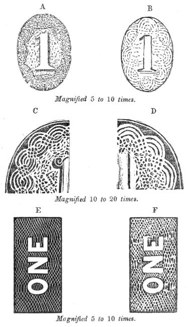The Medallions are raised patterns, or line-engravings, generally representing a head, or some raised fancy patterns in genuine Bank Notes, which look as if raised up from the paper. They are called medallions because they are copied always from and represent the pattern upon a medal. It is done by the Pentograph Ruling Engine, which, guided by the medal, rules the whole pattern in full length lines, and the dies are double transferred to the plate, which makes the lines black, the same in appearance as if the pattern was ruled directly upon the plate itself by the engine. This work is done upon the same principle in mechanics of “guides,” as shoe-lasts are turned by the “Last turning machine.” A model last is used for a guide to the machine, which turns out of a rough-hewn block of wood a last exactly like the model. Thus in genuine medallion ruling there is always a medal or coin used for a “guide.” The points in determining genuine medallions from imitations engraved by hand, are, the lines in the genuine all run in one general direction; they are always full length lines across the whole pattern, the lines are all exactly the same size or caliber, they never cross each other. Every undulation in the pattern on the guide or medal is copied with the most unerring exactness, and articulated distinctly and beautifully correct, which is impossible to be done so perfectly by hand. In the counterfeit the lines are apt to break off in the midst of the pattern; some lines are apt to be coarser than others, which gives it a scratchy appearance. In the genuine, the lines[21] crowd together in the parts of the pattern that appear depressed or sunken, and spread apart more where the pattern appears raised and looks whiter, producing the lights and shades with the most magnificent ease and effect. In the counterfeit done by hand the lines do not crowd and spread apart again, according to the pattern, with such ease and effect, but the patterns appear stiff, flat, or imperfectly raised. There is always one of two ways or alternatives in which the hand-work imitations appear to fail. If they succeed in making the lines full length, as they ought to be, then the pattern will inevitably appear flat in expression, imperfectly raised; but if they succeed in making the pattern look raised, as it ought to be, then there will inevitably be broken or forked lines all through the midst of the pattern. It seems impossible to combine in hand-work imitations of this extremely fine and complicated work full length lines, and at the same time a perfectly finished and raised pattern, which the Pentograph Ruling Engine always does in the highest perfection.