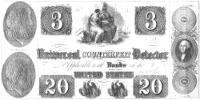 This is altering from a smaller to a larger denomination—as 1s altered to 5s, &c. &c. This is done in various ways. One way it is done by pasting; but it is more generally done by extracting the ink of the figure and the die containing it by some chemical fluid, and printing in its place a counterfeit die, or sometimes a stolen genuine die containing a larger denomination. The words, “ONE DOLLAR,” which generally is shaded by the Ruling Engine, are extracted, and “FIVE DOLLARS” substituted in its place and shaded by hand. A difference also in the color of the ink of the substituted denominations from the rest of the note will generally be seen. Sometimes the letters of the substituted denomination are common printer’s type, the “old English letter,” 🖙 Twenty Dollars.