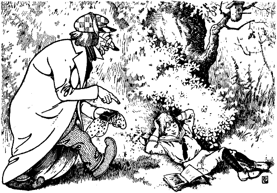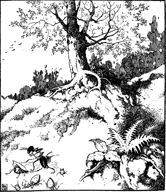 Wie sollte das weitergehen? Kaiser Butziwackel war auf dem besten Wege, im Insektenreiche ein unnützer, gedankenloser Faulenzer zu werden. Eines Morgens saß er rittlings auf dem Gurkenkern, seinem Schloßportal, schaute vergnüglich in die weite Welt und ließ sich von den warmen Sonnenstrahlen bescheinen. Da kam plötzlich ein scharfer Sturmwind, rüttelte und schüttelte die Eiche, daß sie in allen Fasern ächzte und ihre Äste krachend durcheinanderschlug. Die Haustüre fiel aus ihrem Gefüge und stürzte mitsamt dem Kaiser[223] kopfüber in die Tiefe. Wäre Max auf einen harten Stein gefallen, so hätte er sterben müssen. Glücklicherweise aber wuchs unter dem Baume weiches Moos. Max hatte schon im Stürzen vor Schrecken die Besinnung verloren. So lag er jetzt im tiefen Schlaf der Ohnmacht im grünen Moos eingebettet.