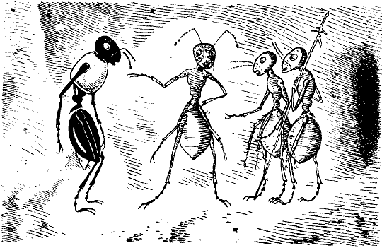 Die allgemeine Anerkennung hatte aber wieder alle schlummernden Gedanken an Ehre und Ruhm aufgerüttelt. So erzählte er seiner vertrauten Freundin von seinen Kriegstaten im Ameisenreich und sprach ihr von seinen Plänen, die darauf hinausgingen, eine gesellschaftliche Neuordnung bei den Insekten durchzuführen, die dem Geiste der Zeit besser entspräche. Die Holzwespe trug in einem starken Körper einen kleinen Geist und war deshalb sofort besiegt von des Kaisers warmer Beredsamkeit, die einem Volksredner alle Ehre gemacht hätte. Entzückt rief sie daher am Schlusse seiner Ausführung aus: