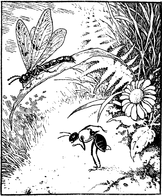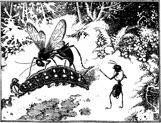 Darum stieg er langsam zum Eingang hinaus und sagte zur Holzwespe, die auf ihn gewartet hatte: