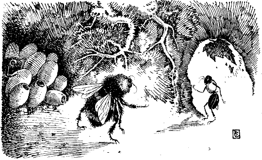 Die Biene unterbrach deshalb ihre Rede, und mit rascher Bewegung schlüpfte sie vollends aus dem Löchlein; sofort erschien hinter ihr ein neuer Kopf. Zuletzt kam auch noch die andere heraus, und alle drei machten eine artige Verbeugung und riefen froh: