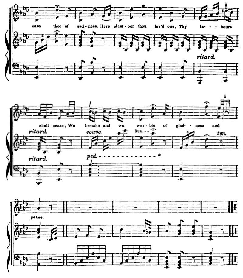 It were much too vast a labor to commence an inquiry into the subject of this essay, with a dissertation on the origin of music. Posterity may be enabled, by the aid of advanced wisdom, to explain the birth of this and other blessings which to us appear only natural, and may, perhaps, successfully trace to their sources the numerous enjoyments which God created as ministers to man’s happiness, and of which we now know only the mere existence. It will not be uninteresting to our children’s children to learn how men first discovered that the various sounds with which the Creator, in his wisdom, invested the human voice, might be linked together in wonderful combinations—producing from monotonous particles melodious unisons; and how a knowledge of the various distinctions which the extension or diminution of time confers on every distinct atom of sound, first dawned upon the human mind, appealing through the senses to the soul, and binding, with a force and power which belong not to any other immaterial agent, the heart of man in chains of amaranthine flowers. These wonders, like many more, which now, for aught we know, lie on the first unturned page of wisdom’s book, will one day be developed.