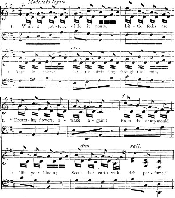 “I doubt very much, dear, if there is any story of Hans 362 Christian Andersen’s which teaches us we ought not to ask pardon, when we have done wrong: I don’t know which you can be thinking of. ‘What the Moon saw’ is a collection of little stories, one of which is supposed to be related every evening by the moon to a poor artist, who was fond of looking at her from his window. The moon relates to him something she has seen on the world every evening. But, Cissy dear, get the book, and read us the story you are thinking of; it is sure to be amusing.”