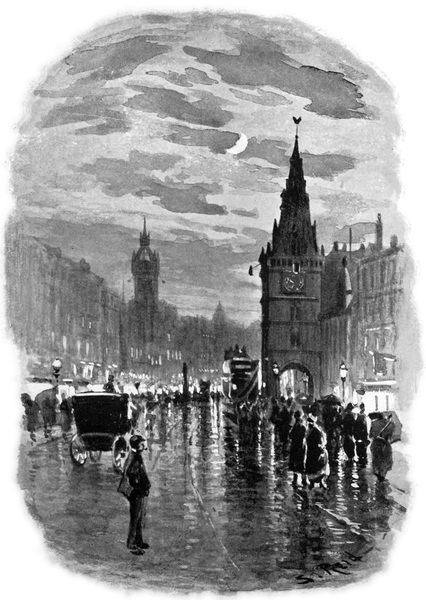 Rather must the city pride herself now upon her glories of the present. Far off, upon the great Clyde artery at Govan, where the nets of the salmon-fishers once hung in the sun to dry, the noise of a myriad hammers has just ceased for the holiday, and the iron skeletons of a hundred ships stand silent in the darkness—spectres not of the past but of the future. Overhead, between the high house-roofs, the heaven is very dark, and above the lanterns of the clock the Tron steeple is hidden from sight; but one side of the neighbouring tower—that of the ancient Tolbooth in High Street—reflects the red glare, from a mile away, of the iron furnaces at Hutchesontown—those undying vestal fires of the nineteenth century; and the golden vane upon the spire shines, strangely lit, alone in the dark heaven. Significant indications, these, of the strong modern life that throbs in the veins of the ancient city.