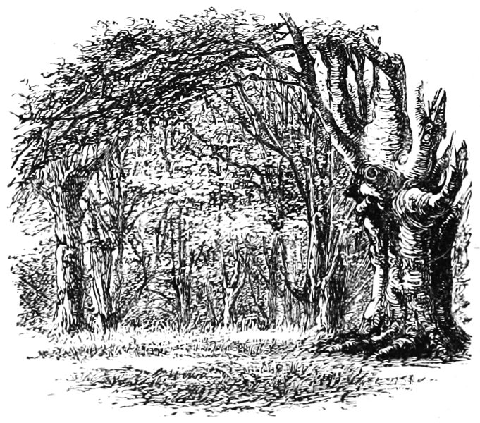 A few words, too, must be said about the two principal tree-forms which now make the Forest. The oaks here do not grow so high or so large as in many other parts of England, but they are far finer in their outlines, hanging in the distance as if rather suspended in the air than growing from the earth, but nearer, as especially at Bramble Hill, twisting their long arms, and interlacing each other into a thick roof. Now and then they take to straggling ways, running out, as with the famous Knyghtwood Oak, into mere awkward forks. The most striking are not, perhaps, so much those in their prime, as the old ruined trees at Boldrewood, their bark furrowed with age, their timber quite decayed, now only braced together by the clamps of ivy to which they once gave support and strength.[8]