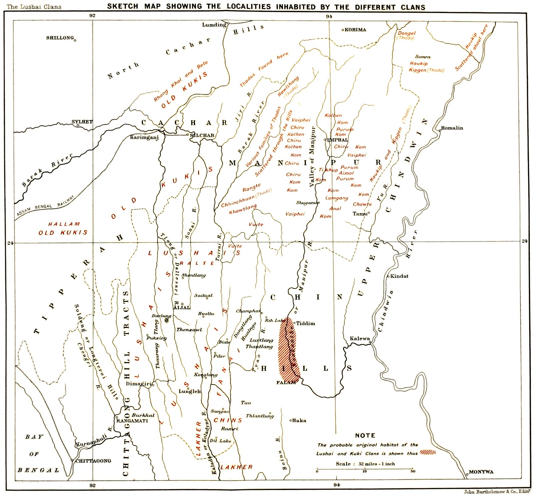 The term Lushai, as we now understand it, covers a great many clans; it is the result of incorrect transliteration of the word Lushei, which is the name of the clan, which, under various chiefs of the Thangur family, came into prominence in the eighteenth century and was responsible for the eruption into Cachar of Old Kukis at the end of that century and of the New Kukis half a century later.