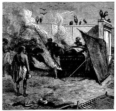 13Self-cremation seems to have been one of the favorite means of disposing of one’s self in ancient times, especially among the royalty and aristocracy. Both tradition and history report of many women, friends, and servants who, of their own free will, mounted the funeral pyre with the departed head of the family. Besides Hercules and Dido, already mentioned, Sardanapalus, the last king of the Assyrians, burned himself in the year 600 before Christ, because the Tigris had destroyed the fortifications of besieged Nineveh, and the following also mounted the pyre for the same purpose: Marpessa, Polydora, and Cleopatra (Vide Pausanias, 4, 2), three noble women of Messenia, and Euadne, the wife of Capaneus, who threw herself into the flames which consumed her husband. The pyre of Sardanapalus, we are told, was very large and contained many rooms, which were elegantly furnished, and in which the royal treasures were heaped up, before the king entered them with his women, while his servants set the pile on fire. It is well known that the widows of India, until very recently, perished of their own free will in the flames that consumed their husbands.
