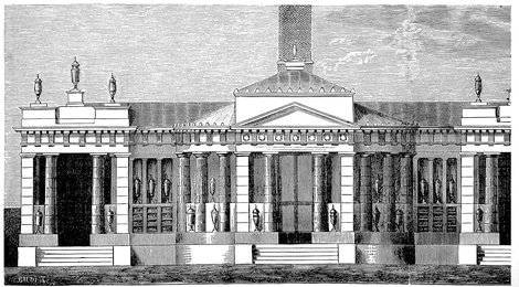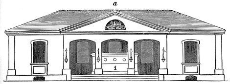 The site was selected in order to carry out the first plans of the edifice, which were those of a Grecian temple. The plans have been modified and modernized so that only a remnant of the classical design is left. The front portion of the building will be, when finished, two stories high. The rest of the structure is one story high, and is built of plain red brick. The dimensions 236are 38 × 74. Light is admitted to the interior of the building by skylights in the roof, as well as by the half-dozen windows on each side.
