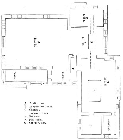 The entire time of the committee was taken up by the formation of a stock company, which proposes the erection of a crematory. Influenced by flattering prospects, the promoters of the project had prepared by Messrs. Spiers and Rohns, architects, plans for a handsome crematorium. The chart shows three divisions, viz.: the exterior of the building, the main floor, and the basement.