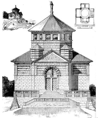 The Buffalo crematorium, which was finished recently, 238is of a composite style of architecture, and is constructed of Medina stone, with a slate roof. The outline of the building is a pleasing one, and the architecture is of such a character that it resembles a church more closely than a place where any mechanical operation is carried on. The grounds of the company are entered from Delavan Avenue by a spacious roadway, running to a porch and then passing around the building to the door of the mortuary chamber, on the east side. Those who accompany the body alight at the porch, and pass thence into the auditorium. The body itself is removed from the hearse at the door of the mortuary chamber.