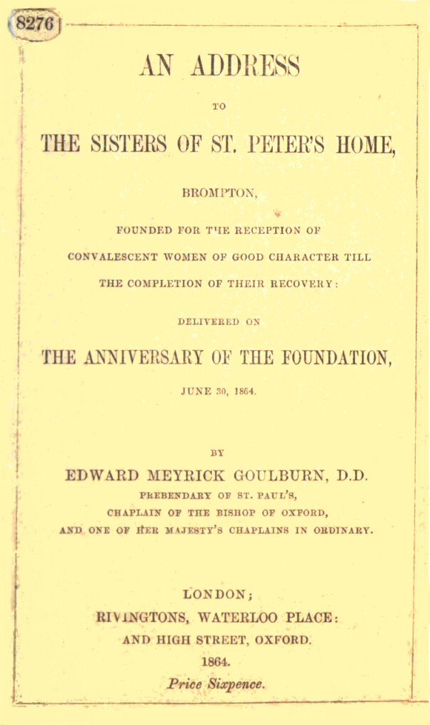 My only reason is, that the Founder of the Home pressed their publication, under the idea that it might be of some use in making the Institution known. As he is one of those munificent Benefactors of the Church, occasionally found among the wealthy Laity of this great City, to whom the Clergy at all events are bound to hold out the right hand of fellowship, I did not feel at liberty to decline his request when it was pressed upon me. In the vigilant superintendence of our Diocesan (who kindly permits me to inscribe these pages to him) we have every guarantee that reasonable people can desire for St. Peter’s Home being conducted on the soundest principles, for its members being kept in faithful allegiance to the Church of their Baptism, warned against and secured from those dangers to which the experience of the Church teaches that Religious Communities are exposed, and made a great blessing to those who are sheltered and tended in their quiet retreat, and to the poor and sick people in their neighbourhood.