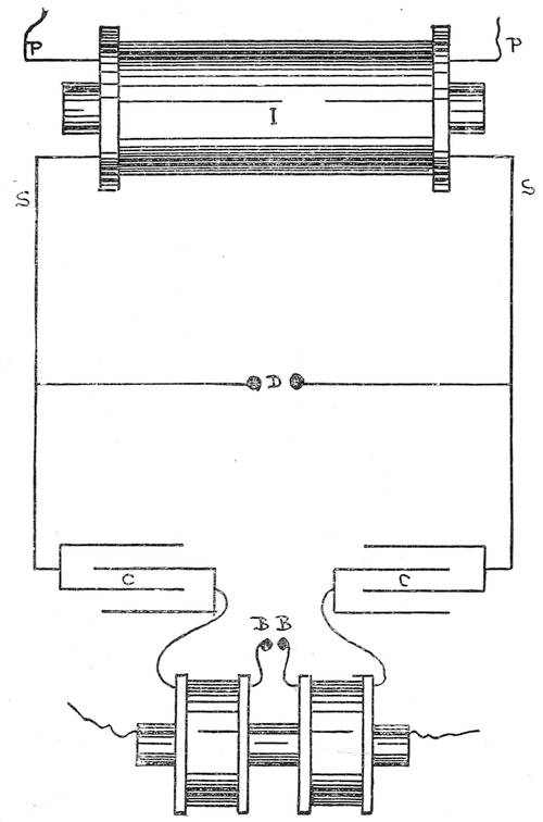 Page 55. Should read, "Cords being attached to binding posts Nos. 1 and 2 are in circuit with the Secondary Coil only. When at Nos. 2 and 3 they receive the induced current or extra current in the Primary."