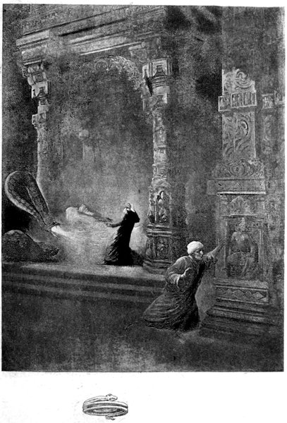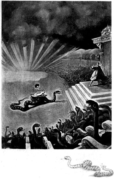 She said, It hath reached me, O auspicious King, that the Wazir Shamhur rose to Hasib and seated him on a chair at the right hand of King Karazdan; after which he called for food and the tables were laid. And when they had eaten and drunken and washed their hands, Shamhur stood up (while all present also stood to do him honour) and, approaching Hasib said to him, “We are all thy servants and will give thee whatsoever thou askest, even were it one half the kingdom, so thou wilt but cure the King.” Saying this, he led him by the hand to the royal couch, and Hasib, uncovering the King’s face, saw that he was at last fatal stage of the disease; so he wondered at their hoping for a cure. But the Wazir kissed his hand and repeated his offers and ended with saying, “All we want of thee is to heal our King:” so he said to the Wazir, “True that I am the son of Allah’s prophet, Daniel, but I know nothing of his art: for they put me thirty days in the school of medicine and I learnt nothing of the craft. I would well I knew somewhat thereof and might heal the King.” Hearing this, the Grand Wazir said, “Do not multiply words upon us; for though we should gather together to us physicians from the East and from the West, none could cure the King save thou.” Answered Hasib, “How can I make him whole, seeing I know neither his case nor its cure?” Quoth the Minister, “His healing is in thy hands,” and quoth Hasib, “If I knew the remedy of his sickness, I would heal him.” Thereupon the Wazir rejoined, “Thou kennest a cure right well; the remedy of his sickness is the Queen of the Serpents, and thou knowest her abiding-place and hast been with her.” When Hasib heard this, he knew that all this came of his entering the Baths, and repented whenas repentance availed him naught; then said he, “What is the Queen of the Serpents? I know her not nor ever in all my life heard I of this name.” Retorted the Wazir, “Deny not the knowledge of her, for I have proof that thou knowest her and hast passed two 388years with her.” Repeated Hasib, “Verily, I never saw her nor even heard of her till this moment;” upon which Shamhur opened a book and, after making sundry calculations, raised his head and spake as follows. “The Queen of the Serpents shall foregather with a man who shall abide with her two years; then shall he return from her and come forth to the surface of the earth, and when he entereth the Hammam-bath his belly will become black.” Then said he, “Look at thy belly.” So Hasib looked at his own belly and behold, it was black: but he persisted in his denial and said, “My belly was black from the day my mother bare me.” Said the Wazir, “I had stationed three Mamelukes at the door of every Hammam, bidding them note all who entered and let me know when they found one whose belly was black: so, when thou enteredst, they looked at thy belly and, finding it black, sent and told me, after we had well-nigh lost hope of coming upon thee. All we want of thee is to show us the place whence thou camest out and after go thy ways; for we have those with us who will take the Queen of the Serpents and fetch her to us.” Then all the other Wazirs and Emirs and Grandees flocked about Hasib who sorely repented of his misdeed; and they conjured him, till they were weary, to show them the abode of the Queen; but he ceased not saying, “I never saw nor heard of the matter.” Then the Grand Wazir called the hangman and bade him strip Hasib and beat him a sore beating; and so they did till he saw death face to face, for excess of pain, and the Wazir said, “We have proof that thou knowest the abiding-place of the Queen of the Serpents: why wilt thou persist in denial? Show us the place whence thou camest out and go from us; we have with us one who will take her, and no harm shall befal thee.” Then he raised him and bade give him a dress of honour of cloth of red gold, embroidered with jewels, and spoke him fair till Hasib yielded and said, “I will show you the place.” At this the Wazir rejoiced with great joy and took horse with all his many and rode, guided by Hasib, and never drew rein till they came to the mountain containing the cavern wherein he had found the cistern full of honey. There all dismounted and followed him as he entered, sighing and weeping, and showed them the well whence he had issued; whereupon the Wazir sat down thereby and, sprinkling perfumes upon a chafing-dish, began to mutter charms and conjurations; for he was a crafty magician and diviner and skilled in spiritual arts. 389He repeated three several formulas of conjuration and between each threw fresh incense upon the fire, crying out and saying, “Come forth, O Queen of the Serpents!;” when behold, the water of the well sank down and a great door opened in the side, from which came a mighty noise of crying like unto thunder, so terrible that they thought the well had caved in and all present fell down fainting; nay, some even died for fright. Presently, there issued from the well a serpent as big as an elephant, casting out sparks, like red hot coals, from its eyes and mouth and bearing on its back a charger of red gold, set with pearls and jewels, in the midst whereof lay a serpent from whose body issued such splendour that the place was illumined thereby; and her face was fair and young and she spoke with most eloquent tongue. The Serpent-queen turned right and left, till her eyes fell upon Hasib, to whom said she, “Where is the covenant thou madest with me, and the oath thou swarest to me, that thou wouldst never again enter the Hammam-bath? But there is no fighting against Fate nor hath any ever fled from that which is written on his forehead. Allah hath appointed the end of my life for thy hand to hend, and it is His will that slain I be and King Karazdan be healed of his malady.” So saying, she wept with sore weeping and Hasib wept to see her weep. As for the abominable Wazi