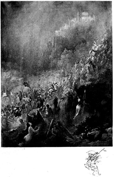 She said, It hath reached me, O auspicious King, that the Marid-guards let down the litter at the capital of King Teghmus who had been routed and had fled from his foes into the city, where he was in sore straits, King Kafid having laid close siege to him. He sought to save himself by making peace with the King of Hind, but his enemy would give him no quarter; so seeing himself without resource or means of relief, he determined to strangle himself and to die and be at rest from this trouble and misery. Accordingly he bade his Wazirs and Emirs farewell and entered his house to take leave of his Harim; and the whole realm was full of weeping and wailing and lamentation and woe. And whilst this rout and hurly-burly was enacting, behold, the Marids descended with the litter upon the palace that was in the citadel, and Janshah bade 377them set it down in the midst of the Divan. They did his bidding and he alighted with his company of handmaids and Mamelukes; and, seeing all the folk of the city in straits and desolation and sore distress, said to the Princess, “O love of my heart and coolth of mine eyes, look in what a piteous plight is my sire!” Thereupon she bade the Marid-guard fall upon the beleaguering host and slay them, saying, “Kill ye all, even to the last man;” and Janshah commanded one of them, by name Karátash,[565] who was exceeding strong and valiant, to bring King Kafid to him in chains. So they set down the litter and covered it with the canopy; then, having waited till midnight, they attacked the enemy’s camp one of them being a match for ten; or at least for eight. And while these smote the foes with iron maces, those mounted their magical elephants and soared high in the lift, and then swooping down and snatching up their opponents, tare them to pieces in mid-air. But Karatash made straight for Kafid’s tent where he found him lying in a couch; so he took him up, shrieking for fear, and flew with him to Janshah, who bade the four Marids bind him on the litter and hang him high in the air over his camp, that he might witness the slaughter of his men. They did as the Prince commanded them and left Kafid, who had swooned for fear, hanging between earth and air and buffetting his face for grief. As for King Teghmus, when he saw his son, he well-nigh died for excess of joy and, crying with a loud cry, fell down in a swoon. They sprinkled rose-water on his face, till he came to himself, when he and his son embraced and wept with sore weeping; for he knew not that the Jinn-guard were battling with King Kafid’s men. Then Princess Shamsah accosted the King and kissing his hand, said to him, “Sire, be pleased to go up with me to the palace-roof and witness the slaughter of thy foes by my father’s Marids.” So he went up to the terrace-roof and sitting down there with his daughter-in-law, enjoyed watching the Marids do havoc among the besiegers and break a way through the length and breadth of them. For one of them smote with his iron mace upon the elephants and their riders and pounded them till man was not to be distinguished from beast; whilst another shouted in the faces of those who fled, so that they fell down dead; and the third caught up 378a score of horsemen, beasts and all; and, towering with them high in air, cast them down on earth, so that they were torn in pieces. And this was high enjoyment for Janshah and his father and the lady Shamsah.——And Shahrazad perceived the dawn of day and ceased saying her permitted say.