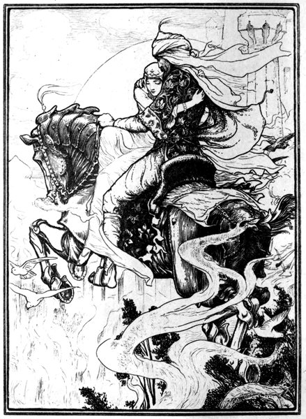 She said, It hath reached me, O auspicious King, that, Janshah and the lady Shamsah abode three months with Shaykh Nasr, feasting and toying and making merry. And at the end of that time she said to Janshah, “I wish to go with thee to thy motherland, where thou shalt marry me and we will abide there.” “To hear is to obey,” answered he and took counsel with Shaykh Nasr, who said to him, “Go thou home, I commend her to thy care.” Then said she, “O Shaykh Nasr, bid him render me my feather-suit.” So the Shaykh bade Janshah give it to her, and he went straightways into the pavilion and brought it out for her. Thereupon she donned it and said to him, “Mount my back and shut thine eyes and stop thine ears, so thou mayst not hear the roar of the revolving sphere; and keep fast hold of my feathers, lest thou fall off.” He did as she bade him and, as she stretched her wings to fly, Shaykh Nasr said, “Wait a while till I describe to thee the land Kabul, lest you twain miss your way.” So she delayed till he had said his say and had bidden them farewell, commending the Prince to her care. She took leave of her sisters and bade them return to her folk and tell them what had befallen her with Janshah; then, rising into the air without stay or delay she flew 352off, like the wafts of the wind or the lamping leven. Her sisters also took flight and returning home delivered her message to their people. And she stayed not her course from the forenoon till the hour of mid-afternoon prayer (Janshah being still on her back), when she espied afar off a Wady abounding in trees and streams and she said to Janshah, “I am thinking to alight in this valley, that we may solace ourselves amongst its trees and herbage and here rest for the night.” Quoth he, “Do what seemeth meet to thee!” So she swooped down from the lift and alighted in the Wady, when Janshah dismounted and kissing her between the eyes,[549] sat with her awhile on the bank of a river there; then they rose and wandered about the valley, taking their pleasure therein and eating of the fruits of the trees, until nightfall, when they lay down under a tree and slept till the morning dawned. As soon as it was day, the Princess arose and, bidding Janshah mount, flew on with him till noon, when she perceived by the appearance of the buildings which Shaykh Nasr had described to her, that they were nearing the city Kabul. So she swooped down from the welkin and alighted in a wide plain, a blooming champaign, wherein were gazelles straying and springs playing and rivers flowing and ripe fruits growing. So Janshah dismounted and kissed her between the eyes; and she asked him, “O my beloved and coolth of mine eyes, knowest thou how many days’ journey we have come since yesterday?”; and he answered, “No,” when she said, “We have come thirty months’ journey.” Quoth he, “Praised be Allah for safety!” Then they sat down side by side and ate and drank and toyed and laughed. And whilst they were thus pleasantly engaged, behold, there came up to them two of the King’s Mamelukes of those who had been of the Prince’s company; one of them was he whom he had left with the horses, when he embarked in the fishing-boat and the other had been of his escort in the chase. As soon as they saw Janshah, both knew him and saluted him; then said they, “With thy leave, we will go to thy sire and bear him the glad tidings of thy coming.” Replied the Prince, “Go ye to my father and acquaint him with my case, and fetch us tents, for we will tarry here seven days to rest ourselves till he make ready his retinue to meet us, that we may enter in stateliest state.”——And Shahrazad perceived the dawn of day and ceased to say her permitted say.