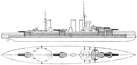 Speed: 22 knots; Guns: 10 13·5in., 16 4in.; Torpedo tubes: 5.